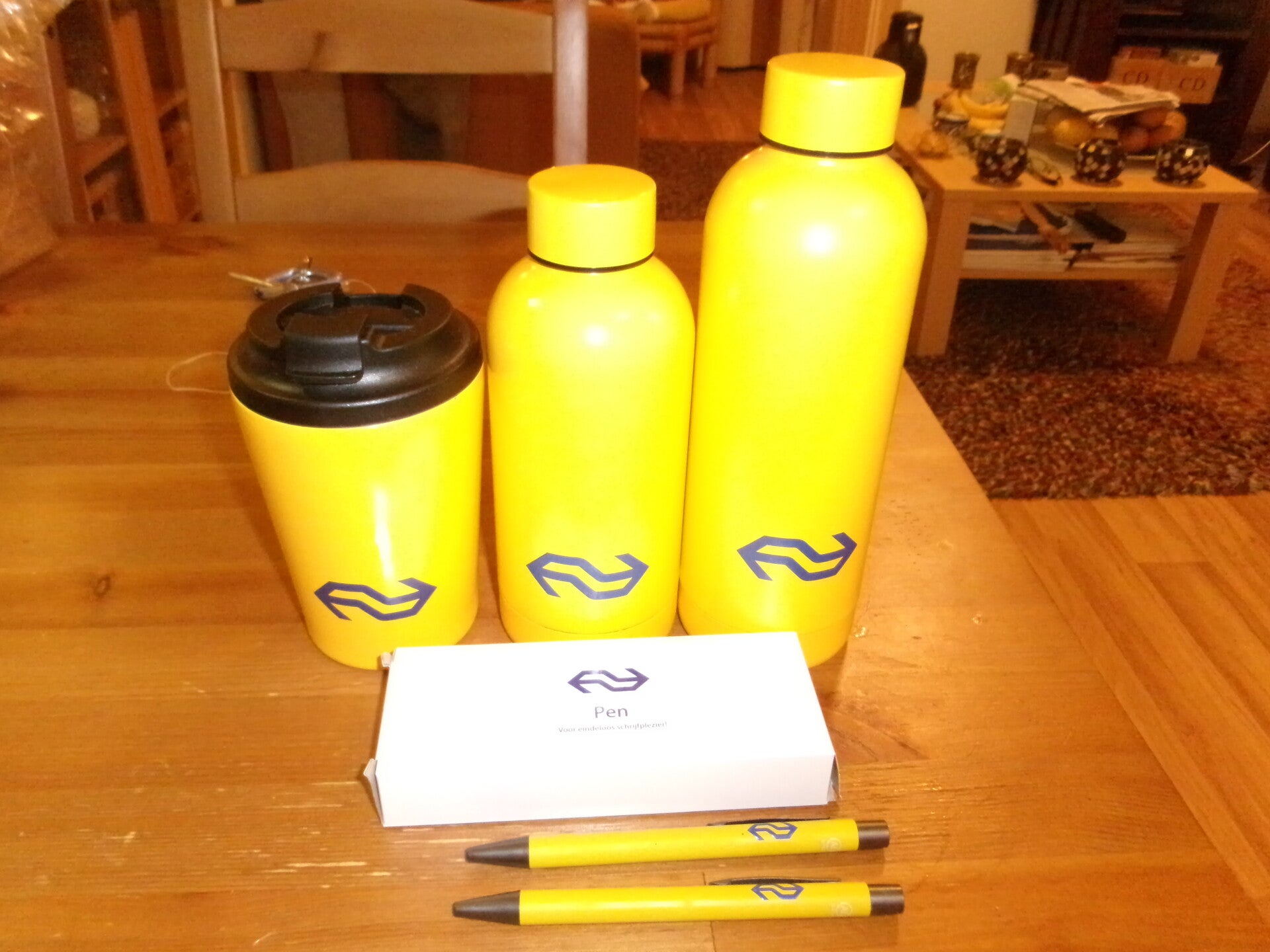 Wie wil dit niet een NS koffiebeker, thermosfles(sen) en een set pennen (á 10 stuks) maar is nog veel meer te bestellen zoals een NS knuffeltrein of een NS knuffelbeer en omdat ik vaak met de trein moet en ik als vaste klant ben kan iedereen dat wel kopen. Mensen die vaak op de NS gaan mopperen moeten dat vooral niet gaan doen. Maar ik zelf mopper niet zo vaak op de NS. Het is maar hoe je dat persoonlijk ervaart. Maar met je auto in de file staan krijg je anders weer een ander gemopper. Ik ben wel een Weesper mop maar ach tja....samen mopperen ya gezellig toch. Hi hi hi hi hi